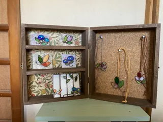 ステンドグラス ディスプレイBOXに、作ったステンドグラスのアクセサリーを、ショップ風に飾ってみました