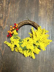 スーパーで3本入り398円という安さで出ていたミモザが1束残っていたので買ってきました❣️フルリースを作るには足りなかったので、ハーフリースにしました🍀以前セリアで買った造花の実を差し色に使いました😊