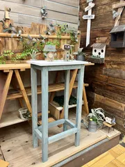 ハイテーブル ハイテーブル作り🔨すぐできると思ってたけど、意外に時間かかった😅もともと置いている木製の食器棚に並べる予定で、バニラ色にしようと思ってたけど、アンティークに仕上げられた見本を見て、ブロンズグリーン&ピュアホワイトに。 お水たっぷり、薄〜く仕上げたら、木目がくっきり浮かび上がり、わざわざアン