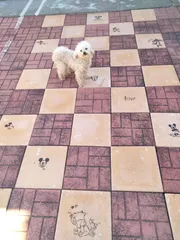 レンガブロック65枚追加ディズニーステンシルして敷き込み完成❣️ 駐車場前スペースを拡げて🚘️車2台分位は広がったかな…草防止と一石二鳥…まだまだお庭メンテナンス途中ブロックで花壇・ブロックレイアウト・お花植込みやる事いっぱいです…それにしても今日は暑い愛犬はパラソル⛱️下でリラックス🐶🐾ここどんな感じに仕上げるか考え中❗