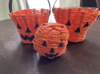 ハロウィンキャンペーン2022「クラフトテープでパンプキンかご」 主人の妹が職場でクラフトテープを使ったかご作りを体験したそうで、材料を分けてもらいやり方を教えてもらいました。左がお手本の先生の作品。真ん中は材料が足りなくなってきたので小さめのディスプレイを作りました。ちょうどハロウィンのディスプレイがほしかったので気に入ってます😊右はかごを作りましたが黒のテープ