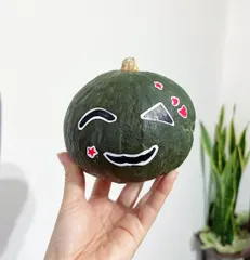 ハロウィンは、まず初めに定番のオバケカボチャから🎃 たまたま飾ってくださいといただいたので、顔を描いてみました😅 品種はわかりませんが、食べられるそうなので、来月には美味しくいただこうと思ってます🎶