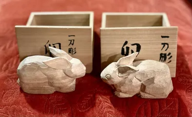 一刀彫の卯 あけましておめでとうございます。今年最初の作品投稿です。画像のうさぎは、13年前に奈良市主催の体験教室「来年の干支を彫る」という一刀彫の講座に当時11歳だった娘と2人で参加して彫ったものです。私と娘は36歳差ですが同じ卯年です。娘はうさぎらしく闊達で身軽に我が道を進んでいます。今年還暦の私は飛び跳ね