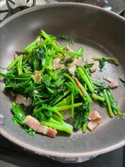 ほうれん草のベーコン炒め 今朝ほうれん草を収穫から、母に渡すと決まって「おひたし」になってしまうので、少しだけ別にしておいて、のクッキングです。レシピは、きっとよくあるヤツです。バター風味でいただきました。