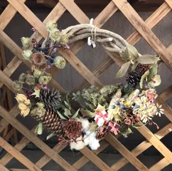 【11月開催】シルクフラワーを使ったリースボード こんにちは、カインズです😊本日は11月に開催のワークショップ『シルクフラワーを使ったリースボード』をご紹介します✨当社指定のシルクフラワーからお好きな色をお選びいただき、クリスマスにピッタリな雰囲気のリースをお作りいただけます👍木材でステンシル入りのボードもお作りいただけますので、セットで飾っていた