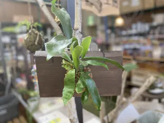 DIYLOVEさん❤️ このコメントに対してのお返事が遅くなってしまい申し訳ございません❗️ 写真のハンギングのは、コウモリランですね! 名札の、テープの下に書いてあります😊 元気でモリモリで羨ましい。 これからが楽しみですね。 このまま育ててもいいですし、いつか板付けもしてみたいのならば、株分けし