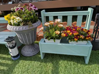 ベンチ型プランター 以前から作りたかったベンチ型プランター。作ってなかなかお花を何にしようとそのままになっていたのをようやく植えてみました。いいサイズの鉢がみつからず、どうしようかと思いましたが、鉢底ネットのしっかりしたものを発見💡二重にしてそのまま軽い培養土を入れてみましたがこぼれないようなので、直植えにしてみました
