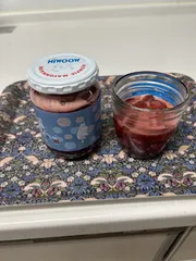 畑のいちごでジャムを作りました🍓 昨日クッキングファンで教えていただいたいちごジャムを作りました🍓昨日収穫したいちごが残っていたのと今日収穫したいちごをジャムにしました🍓かたさの見極め方を教えていただいたので今後は上手に作れるとおもいます⁉️びん🫙に柄があって見にくくてすみません😅