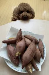 焼き芋🍠 安納芋を頂いたので、オーブンで焼き芋を作りました🍠🍠焼き上がるまで、においに🐶がそわそわ🤣私が椅子から立ち上がると、焼けたの⁉️って🤤焼き上がりを1番楽しみにしている🐶でした🤣