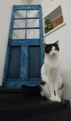 アンティック風ドアオブジェ インディゴブルー(追記、間違えでした。デニムブルー)が気に入って塗料を持ち込みしました😆 塗っているうちに色が濃くなってしまい上と下の色が違う😂下から見たら、遠近法で立体感が出て長く見えるかな😆🎶なんちゃって😜 外で使う予定だけど、猫と一緒に写真撮って遊んでいます😆🎶アレンジもす