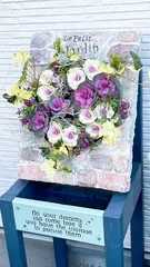 モルタルの土台に100均ザルのリース💐アイデアが詰まっていて、凄く素敵ですね✨ 💗型にも見えて、優しい色合いにも、とても癒されます☺️ 拝見できて、嬉しいです🎶