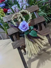 お正月飾り【刺繍追加エプロンもお披露目】 今日は朝から、近くのカインズのグリーンWSへ。縄をなうの、うまく絡まなくて難しかったですが、とっても楽しかった🎵お花の選び方、付け方で皆さん、素敵なお正月飾りができていました。マッキーさんとも久しぶりにご一緒できて楽しかったです🎵 そしてきょうは刺繍を追加したプラチナエプロンもお披露目でし