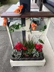 ワイヤーフェンス付きプランター 先月の作品に、やっとお花を入れてハロウィン仕様にしました。