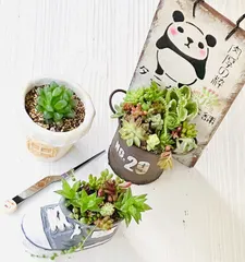 多肉の寄せ植え🪴 先日、squareで知り合ったお友達からリメ缶や鉢を頂き、多肉を寄せ植えしました🌱(Tagさんから頂いた、ハンギングのリメ缶。ステンシルのパンダちゃん🐼が可愛くて、ひと目惚れでした✨)多肉の寄せ植えは何度か経験しているのですが、寄せ植えのセンスが無いようで…😭なかなか納得できる仕上がりにならず、先日
