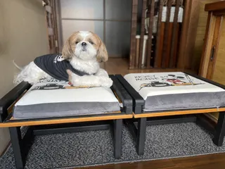 カメラ目線のワンちゃんに目がいってしまいます😍 たためる椅子、いいですね😊