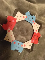 折り紙で、鬼と福の神のリースを作ってみました😆🌼娘が来週からの新学期に幼稚園に持って行くそうです笑っもっと作ってとリクエストがありました💦