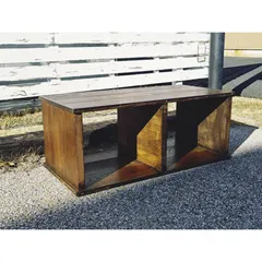 本日完成しました住宅建材端材利用のテレビ台です。 天板地板拡大写真やや左より撮影住宅建築現場端材を利用して作成のテレビ台です。 天板底板はオーク、ウォールナットのフローリング材端材のランダム組み合わせ側板は玄関巾木の端材仕切り板は階段の端材仕上げにウッドワックスを使用しています。
