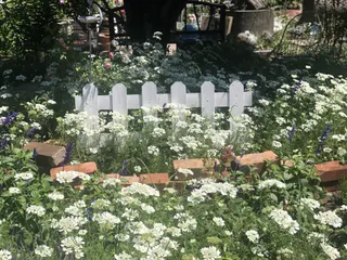 大好きな28'sガーデン🌹 オルラヤが咲いてます♪風にふわふわ〜 グンマー地方、最高気温35℃超え。一気にバラが咲き始めました。アイスバーグのアーチ。 黄色のバラはグラハム・トーマス青いデルフィニーム、涼そう😊オルラヤはこぼれ種で毎年咲いてくれます。咲きまくってます。そこそこに抜かないと歩くとこ