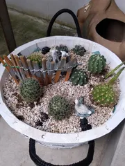 柵、作ってみた! サボテンの寄せ植えの中で飼っている牛、ヤギが逃げ出さないよう柵を作りました。娘の知り合いでハンドメイドしている人から端材(ホントに端材、割り箸みたいな😆)をもらっていて、活用方法を考えていました。 長さはそのままでよく、針金で1本ずつねじりながら綴じました。 塗装はスプレー缶でパ