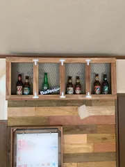 ディスプレイ棚 出張diy💨ビール瓶を飾りたいとの事で棚を作りました😊背板はグレーでペイントしてステンシルは薄っすら見えるくらいの色にしました。扉は100均の網を後ろからビスで固定しました。