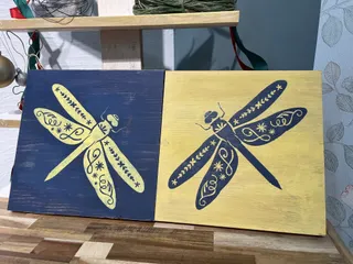 ミニサインボード2回目(黄色背景)の作成です。前回作成した物(青色背景)と一緒に撮影してみました。今日も楽しく作成できましたが、どこに飾るか悩んでしまう...。
