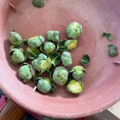 芽キャベツ初収穫 本年もよろしくお願い致します。2022年初投稿です。昨年12月17日に作品投稿した「芽キャベツ」、まだ小さそうでしたが、初収穫してみました。簡単レシピ調べて、①半分に切る②熱湯に塩少々で、2、3分茹でる③フライパンでバター10gで軽く炒めて、醤油で味を整える美味しくいただきました。
