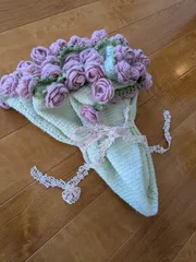 🌹薔薇のブーケット💞完成しました 無事出来上がりました❤️見てくださってた方ありがとうございます💞約17日朝晩のすき間時間頑張りました🤭使ったのはDAISOの🧶一玉200円です❤️ホワイト2玉、ピンク1玉、グリーン少々ですブランケット部分で直径78センチ🥰オマケ😅広げた途端🐾ドヤ顔で乗ってきました😂彼は5.8キロのちょいデカトイプー