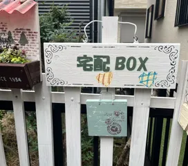 宅配BOXの看板 BOXの上に看板を作りました。ステンシルで頑張ってみたけど難しすぎて何度も失敗して嫌になって放置する事1ヶ月😫ワードアートでプリンターで印刷してコンビニでカラーコピーしてデコパージュして完成👏最初からそぅすれば良かった🤣 そして‼️㊗️ やり方が分からなくて聞きま