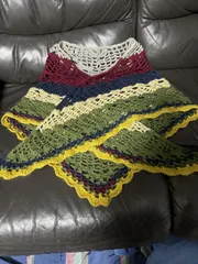 お気に入りのストール あまり毛糸🧶があったので編み図とにらめっこしながら編んだ物です😌持っている毛糸を使い切ったので👌全部で6色足りない毛糸🧶は100均で何個か使ったと思います。お扇中心から編み始めているので最後はよく見ると🧶不足で色が‥。よく見ると分かりますね😜ここんな風は巻いたり無地のモノトーンに近いコートに合わせる