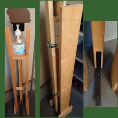 場所をとらない足踏式消毒スタンド これは場所をとらないバージョンの足踏式消毒スタンドです。支柱はカインズの木材1x4x1820mm、上下に動す支柱もホワイトウッド30x19x91mmを、背面はサドルバンドを、足踏部分はセ〇アのアイアンブラケット、消毒液おさえのうさぎはブックスタンドを使用してます。100均のプラスドライバーと下穴あけ