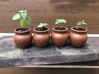 エコにミニグリーン プリンが入っていた陶器の容器、かわいいので穴を開けて植木鉢にしました。 種蒔きして芽が出るのを待っていられなくて、道端で野生化していたサルビアを植えてたら即席ミニグリーンになりました。