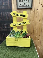 ガーデンサインプランター 持ち込みで黄色に塗ってみました。ステンシルがもう少し上手く行ったらよかったのになぁー次回2個目がんばりまーす。