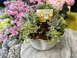 キッチンカーの箱庭 近くの園芸店さんで久しぶりに多肉の寄せ植えをしてきました😊 白色のブリキ缶は予約時に選んで、黄色のキッチンカーはくじ引きで🪴グリーンネックレスを周りに入れてみたけど…完成したらセダムをいろいろ入れ過ぎで見えなくなりました😅💦多肉を触ってる時間は…楽しいですね🎶🤭