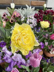 寄せ植えの間からチューリップ🌷も出てきて花盛りです😊