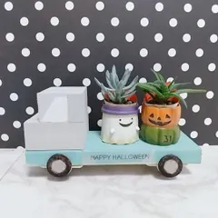 ハロウィントラック 久しぶりの投稿✨端材と百均の材料でインテリアトラック作りました♪キャスターもついてるから動きます♪季節に合わせてディスプレイをかえれるので、今はもちろんハロウィン♪この多肉のハロウィンミニポットもカインズで見つけたものです♪