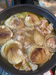 絶品玉ねぎスープ ■材料新玉ねぎ3個、ベーコン50g、水600cc、コンソメ小2、ニンニクチューブ適量、白ワイン大1、オリーブオイル適量、粉チーズ.パセリ適量、塩、黒胡椒適量■作り方 ①新玉ねぎの皮を剥く。芯が付いた状態で半分にカット、全体に塩をして馴染ませる。 ②オリーブオイルで、弱火で、①の玉ねぎをじっくり蒸し焼