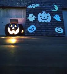 ハロウィン🎃② 100均シリーズ💦レンガ風にステンシルした板に蓄光のプレートをペタペタ貼ってあとは暗くなるのを待つと…こんな感じ。