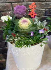 迎春の寄せ植え GWSでした。イツメンで(いつもいくお友達2人と)寄せ植えして来ました!今年最後のワークショップ。左が私のです。 でも、工房のかたわらでは木のリースやミニ門松、ミッキーのしめ縄??などなど楽しそうなワークショップをやっていて、とっても賑わってました。時間があればやって行きたかっ
