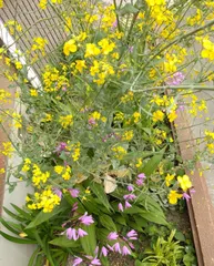 今日の写真、上から撮るとしっかり菜の花が黄色で存在を主張しています。が、もうすぐ5月、そろそろ菜の花はお暇いただいて、と思いますが、咲いていると切れないですよね😂 ボランティア花壇次点作品です。しばらく訪問していなかったので雑草抜いていないので😆 奥から・アガパンサス・紫蘭・斑入りヤブ