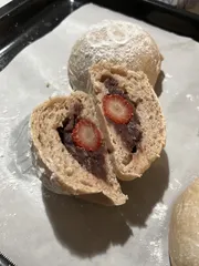 いちごミルクパン【cooking fun】 持ち帰った生地を早速丸めてベンチタイム!こちらは教室で焼き上がった熱々の丸パン ほんのり桜色🌸先生作のミルクパン 薄皮でクリームたっぷり❤️教室の帰り道🚙…🍓を買って帰りました!ジャム用となってましたが、完熟の甘い「やよいひめ」さてどうしよう?先生はフレッシュのフルーツは難しい😓と言われてましたが、