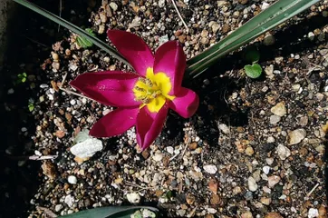 大袋で球根を花壇にまいたので、どんな色の花が咲くのかわからなくて、突然のビビッドカラーのクロッカス風の花にビックリ😅白や淡い色のイメージがあったので、明るい色に元気をもらいます🌱🌱🌱 原種系チューリッププルケラペルシャンパールでした😋