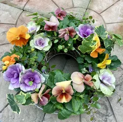 パンジーと葉牡丹のリングリース Greenワークショップで作成した、パンジーと葉牡丹のリングリース🌸寒いからオレンジ系🧡で暖かみを出してみました。今年は葉牡丹の生育がイマイチなのかな。