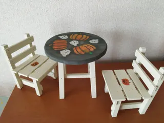 ハロウィン🎃大好き人間です。オママゴトが大好きなお孫ちゃんにプレゼント用🎁に作って見ました。 テーブルの脚を斜めにするのが😥難しくてアドバイザーの方にアドバイスしてもらいましたが😫逆さまに付けてしまったり😮💨自分が蒔いた種なのに、途中で投げ出したい気分になっちゃって テーブルの