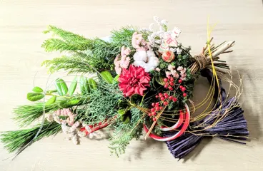 お正月飾り🍊🪁 お正月飾り🍊🌿を作りました🤗💕 しめ縄リースです🪁 紫色のしめ縄に、若松を始めスギなどのフレッシュな葉や枝を取付け、水引を加えることで、お正月🍊らしくなりました🌿おめでたい🤩✨お花屋さんでのWS、作っている間は、一生懸命で寒さ⛄❄も忘れる程でした🤗🪇🥁♬♪