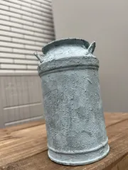 おしゃれな庭にあるもの その2 おしゃれな庭にあるもの、その2ミルク缶。 ヌガーが入っていた缶がちょうどミルク缶だったので、ザラザラベース塗って色塗ってみました。 DAISOのモルタル風塗料のブルーで塗ってから、シルバーのアイアン風塗料をポンポンと塗ってみました。 でもやっぱりサイズが小さ