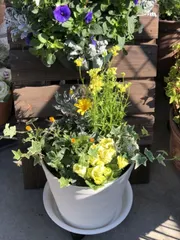 黄色がテーマカラーの寄せ植え、春らしくフレッシュな感じがしますね。 あとからチューリップも咲くお楽しみ付きなんですね❣️