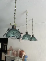 100均でなんちゃってライト おしゃれなお家に、ぶら下がっている3個のライト。憧れですが、なんちゃって💡ぶら下げました。もちろん電気つきません。いいんです。素敵な雰囲気でれば!Seriaのお皿、ワイヤー、チェーン、ダイソーの電球。葉っぱを飾って、アイアンペイントしています。