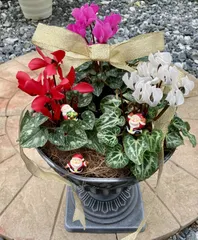 ガーデンシクラメンの真ん中にミニ水仙のダブルデッカーの寄せ植え🌸これにリボン🎗️とサンタ🎅を乗せただけ。簡単クリスマス🎄の出来上がり。