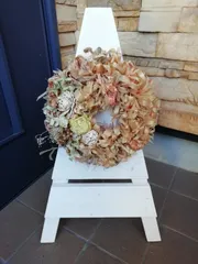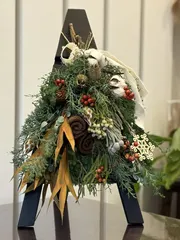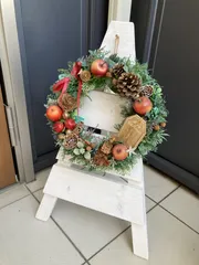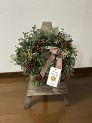 リーススタンドとクリスマスリース リーススタンド、クリスマスリース リースは文化会館のWS、本物の木🌲や実を使用 針金を使いグルグルと枝を巻いて、飾りの実は後でつけました。リボン🎀を可愛めに作りました。 香りもよく、自然素材なでクリスマス用タグを外せば一年中使えます。色が変わっていっても、自然な色なので違和感なく