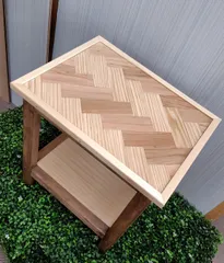 NEW ヘリンボーンサイドテーブル⚒️ ■作品内容念願だったヘリンボーンのサイドテーブルを作りました✨️(≧▽≦)🎶■こだわりポイント・天板の色を変えて並べた所・せっかく綺麗に並べたので そのままの色を出したくて… 持ち込みのクリアを塗りました❣️